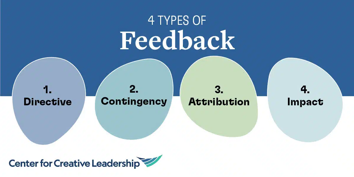 Among the 4 types of feedback, impact feedback is the most effective to start with because it informs a person about the results of their behavior without dissecting the details, assuming motivation, or placing blame. Try using our widely recognized Situation – Behavior – Impact model to give feedback and explore intentions, making the feedback a two-way discussion.