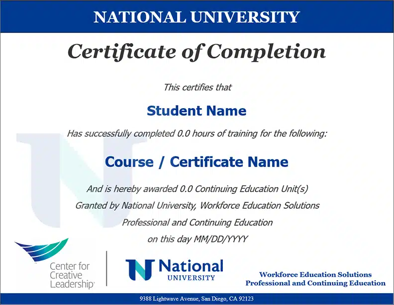 Workforce Education Solutions, a division of the National University System, is pleased to provide our participants with CEU certificates for completed programs.