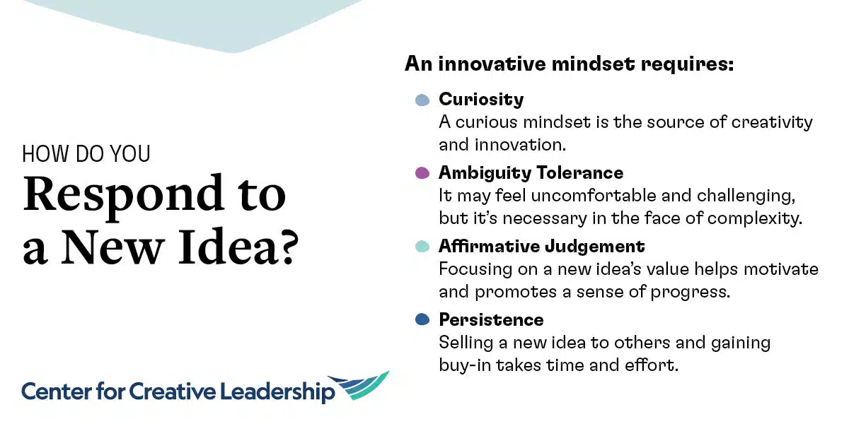 The next time you hear a new idea or are asked to weigh in on a new solution, make a choice to lead with an innovative mindset, and foster innovation.