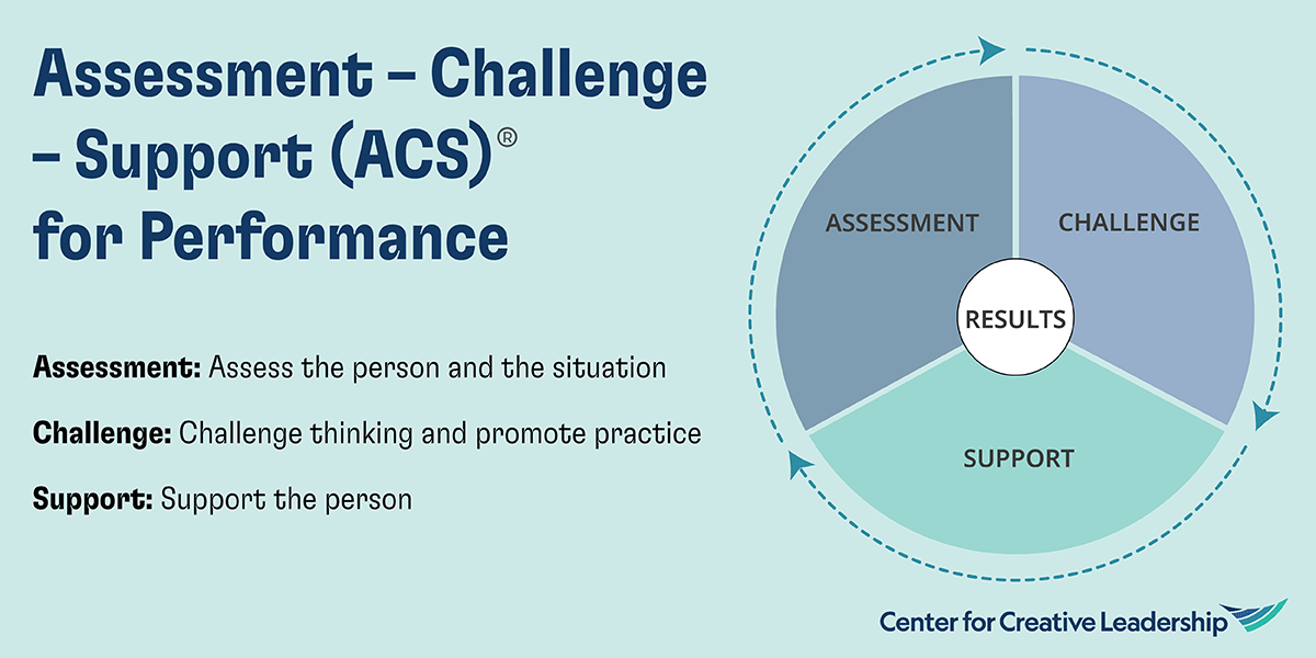 Assessment – Challenge – Support (ACS)™ is our simple, proven leadership coaching framework that provides a clear path for guiding coaching conversations. Instead of relying on a script or feeling pressured to have all the answers, ACS helps you spark self-awareness, stretch thinking, and encourage follow-through.
