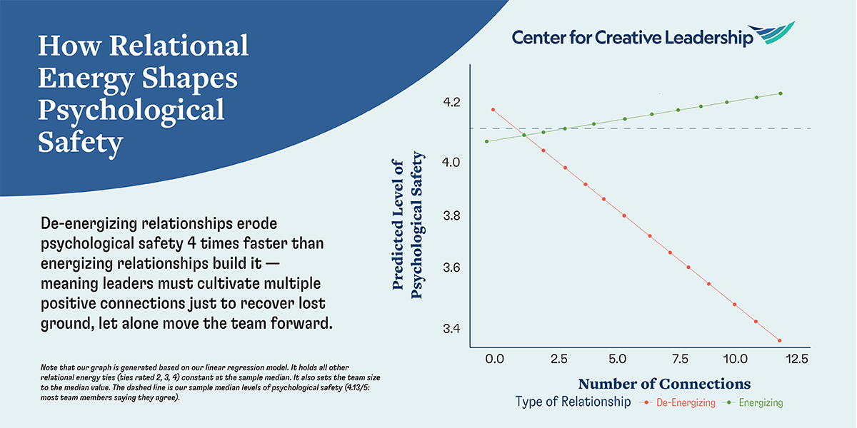 Overall, our results reveal that a team’s relational energy is linked to multiple team outcomes. For example, when predicting psychological safety, having more strongly de-energizing relationships affects the team about 4 times more than having more strongly energizing ties. Put another way, as a team leader you would need to cultivate 4 strongly energizing connections among team members to neutralize the impact of one strongly de-energizing relationship — and that only brings the team back to neutral. To propel the team toward positive energy, you’d need to foster even more strongly energizing relationships.