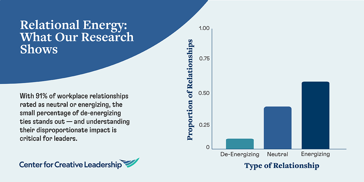 Here’s what our insights show: a single negative relational energy tie cancels out 4 positive relational energy ties. Before we unpack what this means for leaders and its impact on creating a positive work environment, let’s define what “relational energy” is.